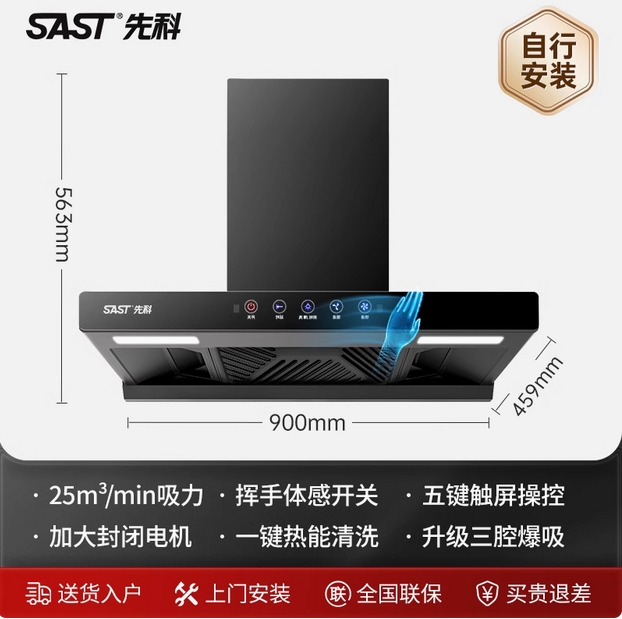 sast先科抽油烟机家用厨房大吸力顶吸式油烟机自动清洗租房吸油机